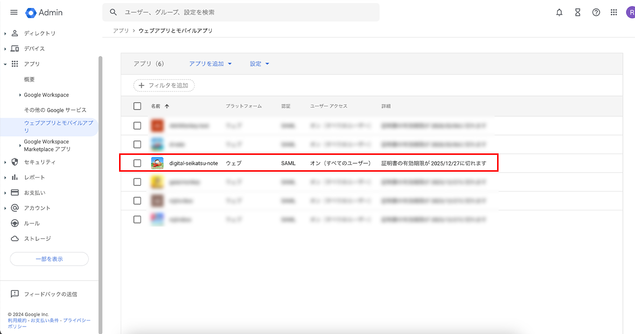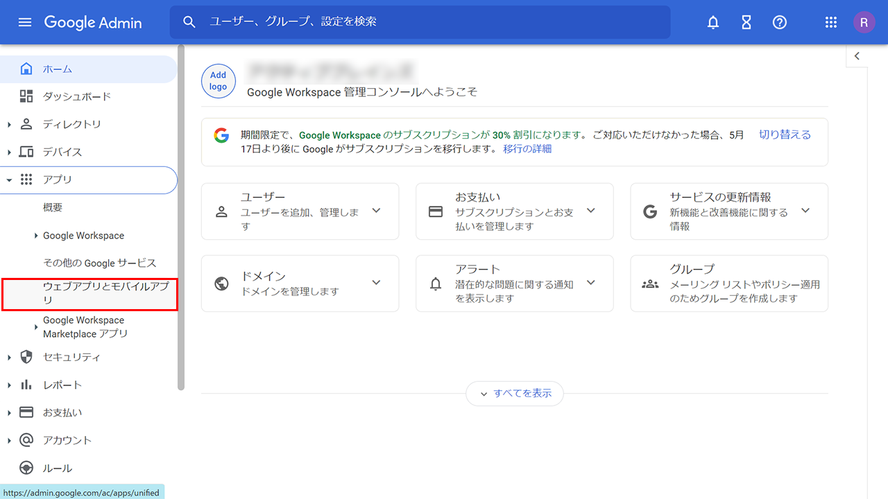 ②右メニュー「アプリ」から、「ウェブアプリとモバイルアプリ」 をクリックします。