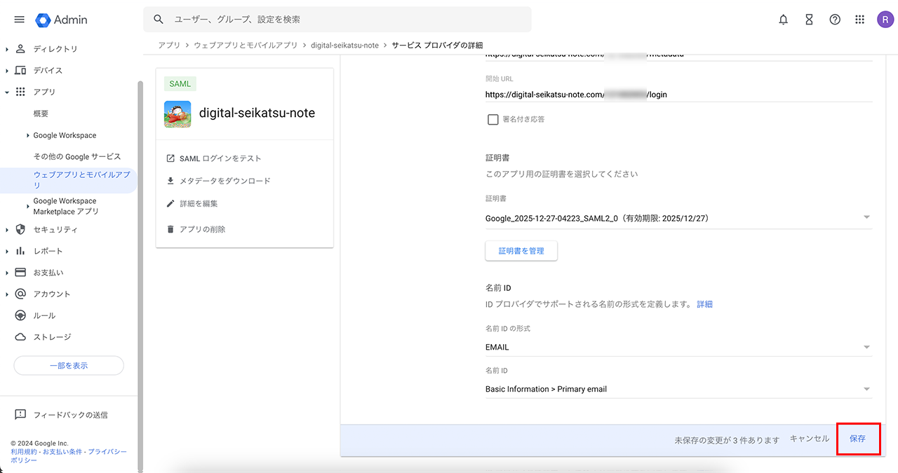 「アプリの詳細」画面が表示されたら、以下の設定を行います。